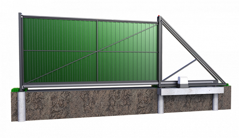 Эта конструкция хороша тем, что над проездом нет балок. Но она — самая дорогая в устройстве. Дело не столько в системе роликов, сколько в необходимости устройства фундамента с металлическими закладными, к которым затем будет крепиться консольная балка. Если столбы уже есть, фундамент заливается перед ним и вдоль забора на длину технического выноса, который необходим для компенсации нагрузки, создаваемой полотном.