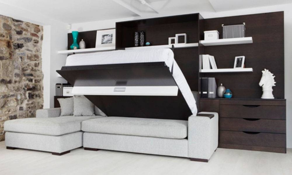 - Откидная кровать-трансформер с диваном. Отлично подходит для студий и однокомнатных квартир.