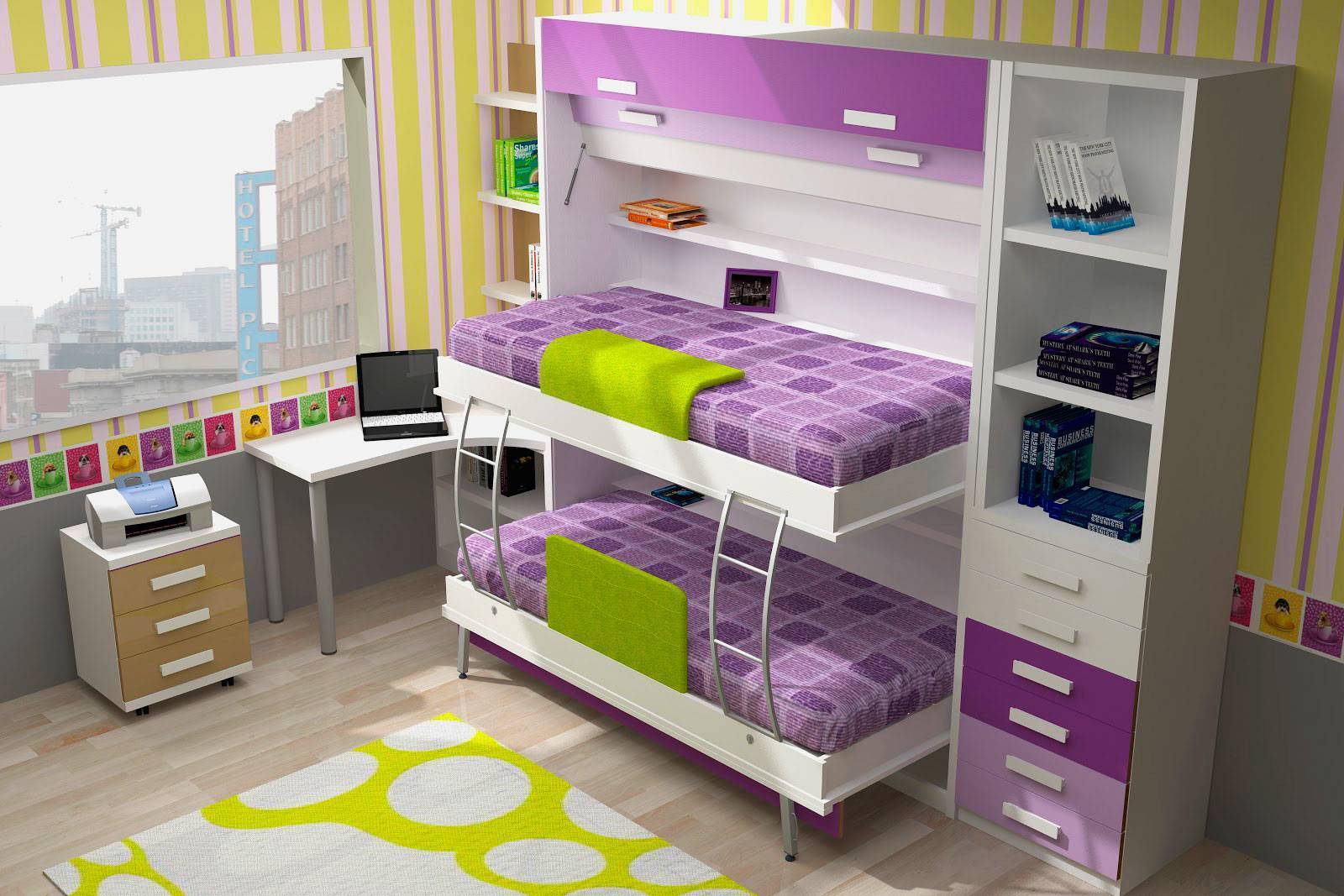 Для детских комнат подойдут шкафы с откидными кроватями двухъярусного типа. Обычно в них 2 спальных места. Также есть модели, оснащенные письменным столом и комодом. Они помогут максимально сэкономить пространство и создать функциональную зону для малыша.