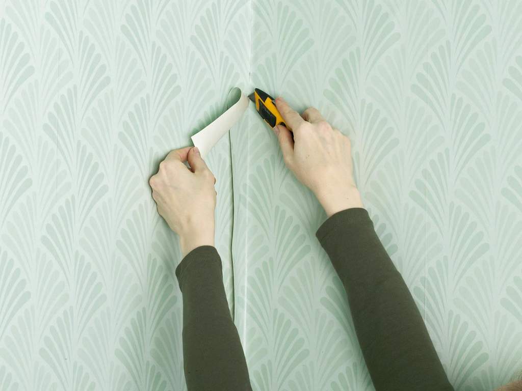 Излишки обоев сверху срезают при помощи широкого металлического шпателя, служащего основой и ограничителем, и канцелярского ножа. Снизу обои можно подрезать ножницами, если плинтуса были демонтированы, или, так же как и сверху, если плинтуса остались.