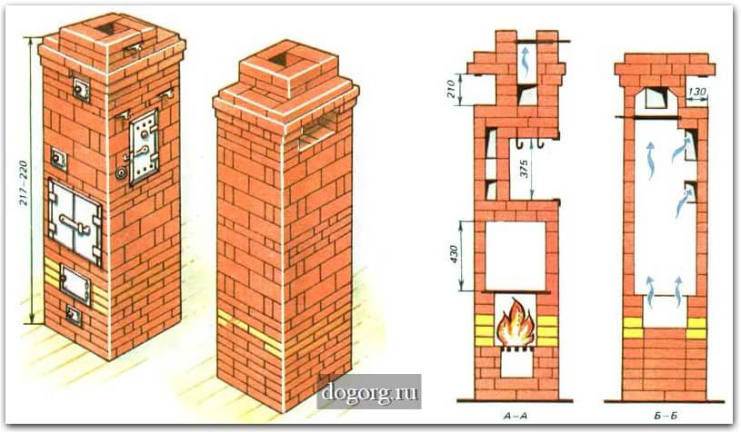 - После того, как перекрывается топочная дверца, в последнем ряду остается только два канала, имеющих квадратное сечение. Как отмечают мастера-печники, порядовки отопительно-варочных печей и других кирпичных агрегатов имеют незначительные отличия.