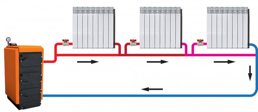 При такой схеме температура дальнего от котла радиатора будет ниже, нежели ближнего. К тому же при выходе из строя одной батареи, остальные также перестанут функционировать, так как они не могут отключаться по отдельности.