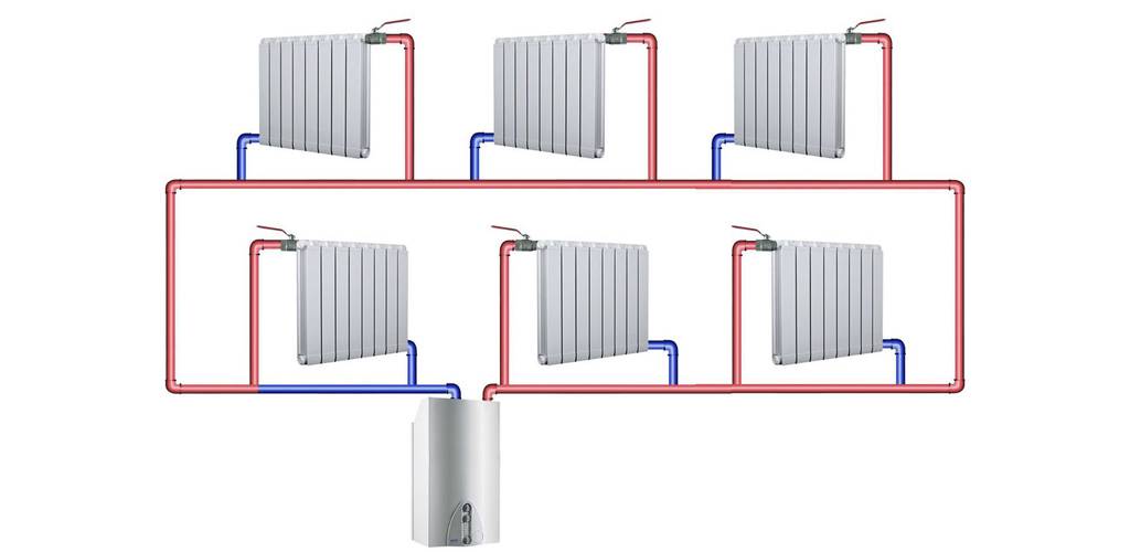 Для обслуживания каждого прибора в двухтрубном отопительном контуре устраиваются подающая и обратная магистраль, благодаря чему температура система поставляет теплоноситель равной температуры во все точки, а остывшую воду собирает и направляет к котлу обратка – независимая от подачи магистраль