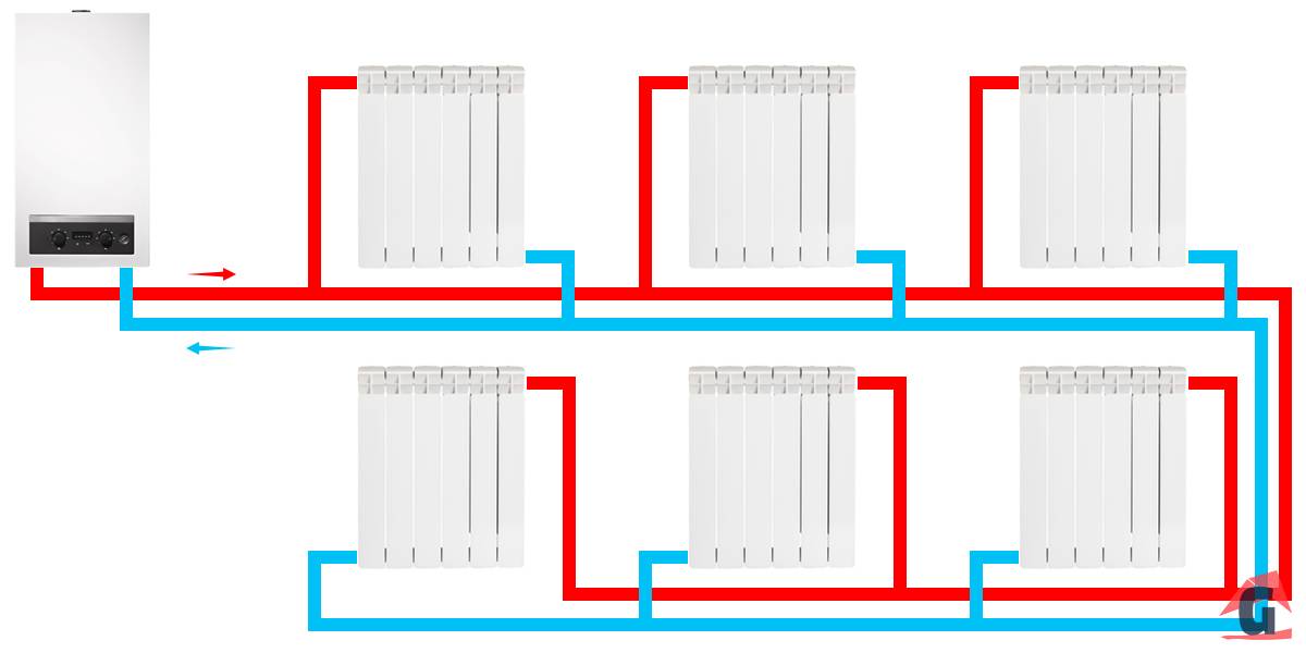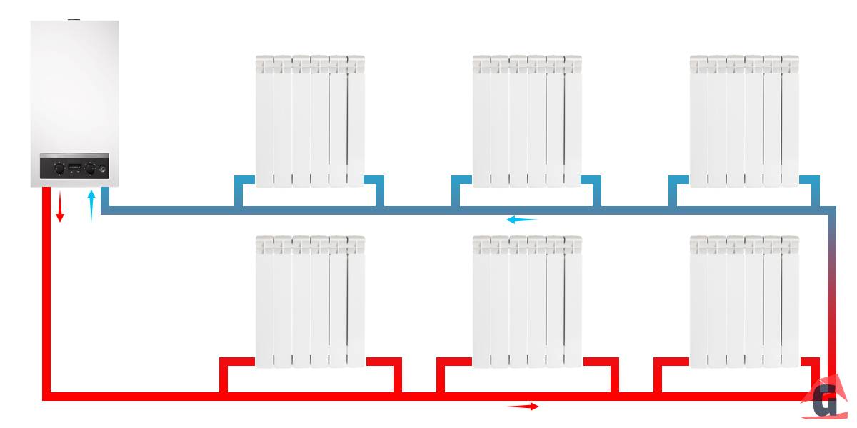 Для обслуживания каждого прибора в двухтрубном отопительном контуре устраиваются подающая и обратная магистраль, благодаря чему температура система поставляет теплоноситель равной температуры во все точки, а остывшую воду собирает и направляет к котлу обратка – независимая от подачи магистраль