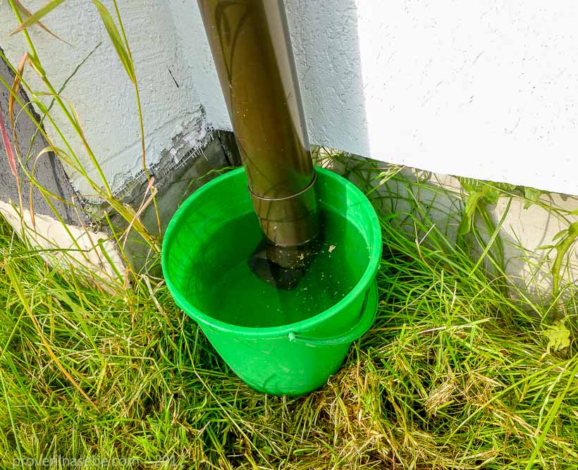 Это не очень удобно. Представьте себе: на улице начался дождь. Вы вышли во двор и запустили процесс слива из всех ведер под всеми стоками. Пока дождь идет достаточно сильно, все работает практически на автомате. Правда, если начнется ливень, то наша система водоотвода “захлебнется”. Просто диаметра шланга не хватит, чтобы своевременно уводить всю воду в низину.
