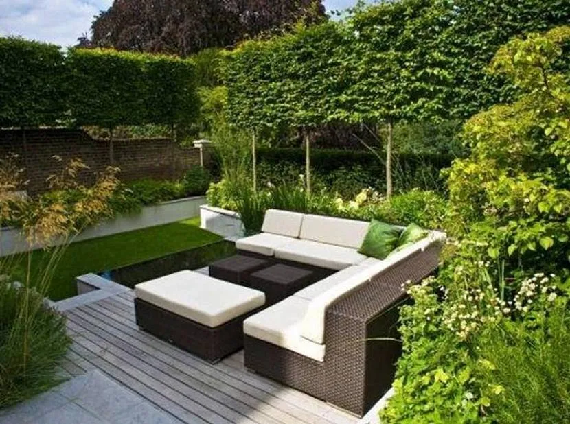 Обязательно наличие аккуратно подстриженного газона. Скамейки заменяются удобными банкетками. Из растений выбираются низкорослые кустарники, декоративные травы, хвойные деревья.