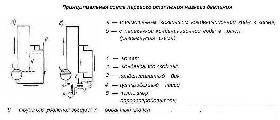 По способу устройства различают паровое отопление двух типов: с замкнутой и разомкнутой системой. В замкнутой системе конденсат стекает в специальную приемную трубу, которая заведена на соответствующий вход кота. Она уложена с небольшим уклоном, так что конденсат движется по системе самотеком.