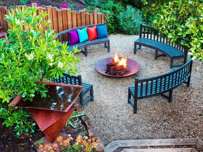 Вокруг кострища ставят по кругу диванчики, кресла, стулья. Материал для мебели подойдет любой: