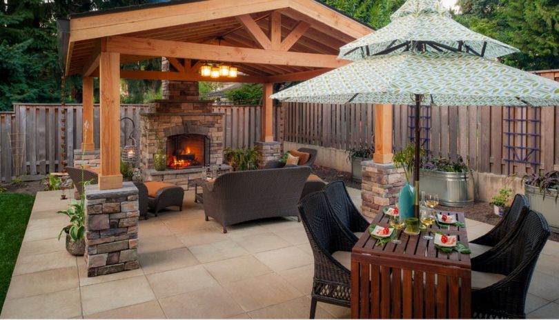 Еще можно вынести мангал за пределы навеса. Тогда для установки патио под красивой крышей ограничений в выборе материалов не будет.