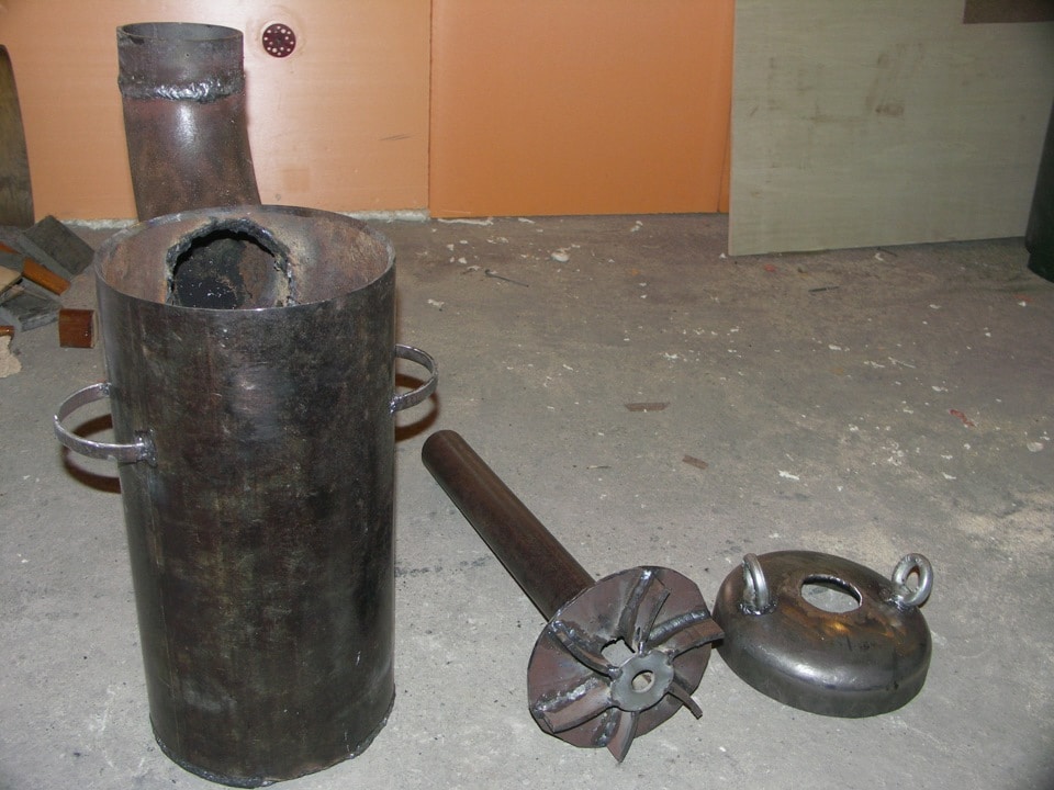 - Основа – металлический бак в форме цилиндра. Внизу расположен колосник и входное отверстие для доступа воздуха.