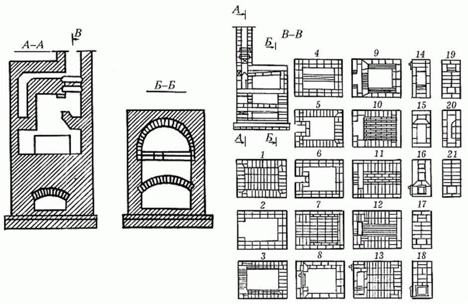 Важно использовать только каленый кирпич, ведь на него будут воздействовать перепады температуры, сырость и другие негативные факторы. Дальше в процессе кладки следует соблюдать порядовый план печи, не отступать от чертежа, использовать измерительные приборы, чтобы исключить неровности. Схема конструкции содержит много дополнительных элементов из металла: дверцы, задвижки, заслонки, колосники и т