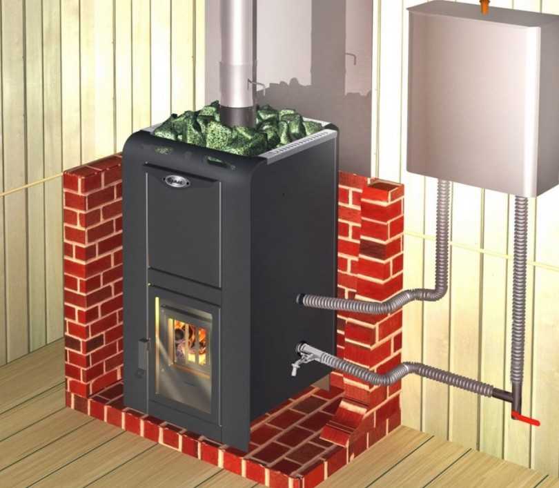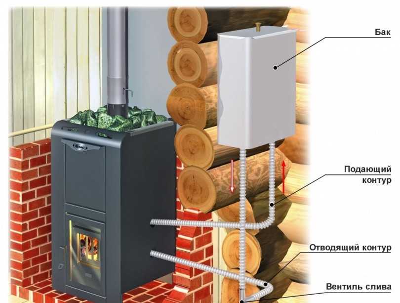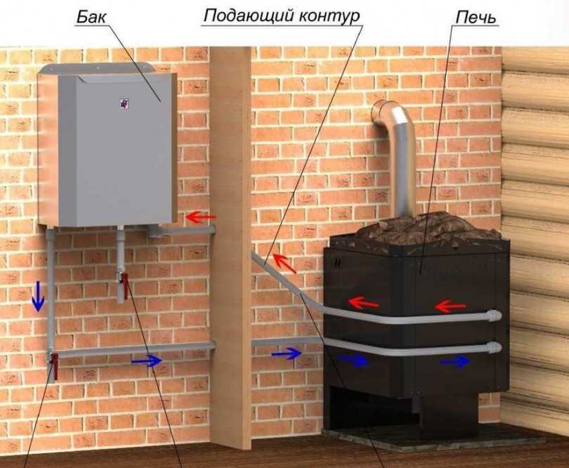 Расположение бака с водой выбирается зависимо от габаритов печного оборудования. Он должен находиться в таком месте, чтобы принимать больше тепла. Для расчета объема бака нужно учитывать, что на одного взрослого требуется примерно 25 литров воды.