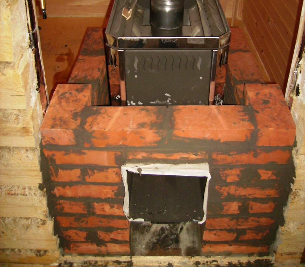 Установка кирпичного экрана возле печи в баню из металла своими руками. Экран можно поставить из керамики. Не забудьте оставить место для монтажа дверцы для контроля уровня прогрева воздуха.