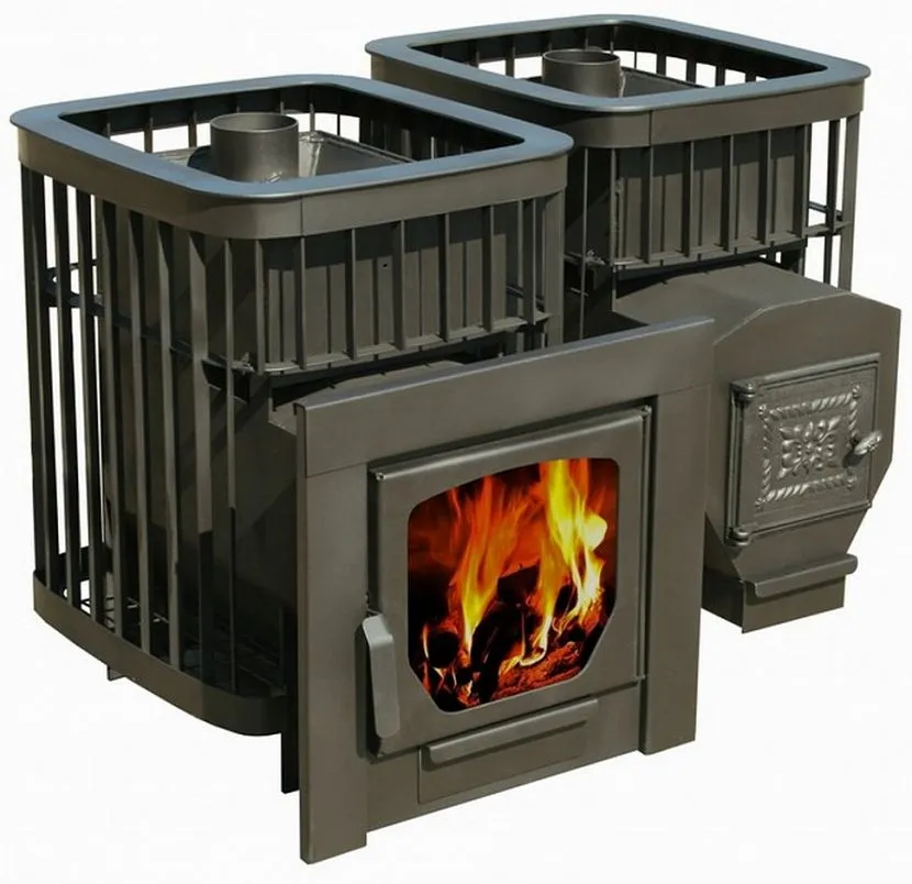 Вместительная банная печь с объемным баком и герметичной топкой.