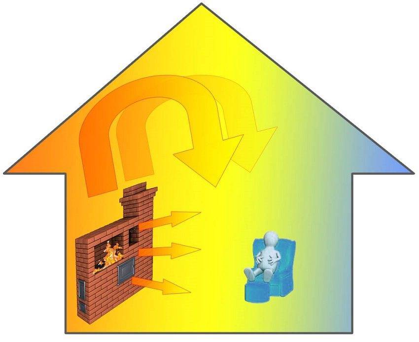 Обычная дровяная печь или камин нагревают помещение за счёт сочетания радиационного и конвекционного теплообмена. Прогревшиеся массивные стены печи излучают тепловую энергию, передавая её воздуху и предметам обстановки помещения. Холодный воздух постепенно замещается нагретым.