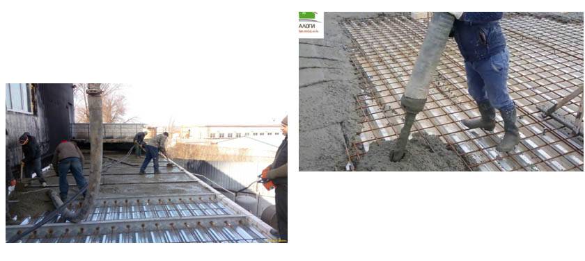 Данная технология предусматривает заливку бетонной смеси в один заход. Выравнивание по всей поверхности выполняется с помощью строительной гладилки. Уплотняется бетонный слой глубинным вибратором. Для «железнения» поверхности и предохранения от внешних воздействий используется сухой цемент. Если не получается сразу залить всю площадь перекрытия из профилированных листов, тогда укладка бетона осуществляется в каждый пролет и за несколько этапов. При поэтапном бетонировании следует фиксировать сроки, чтобы вовремя демонтировать дополнительные опоры.