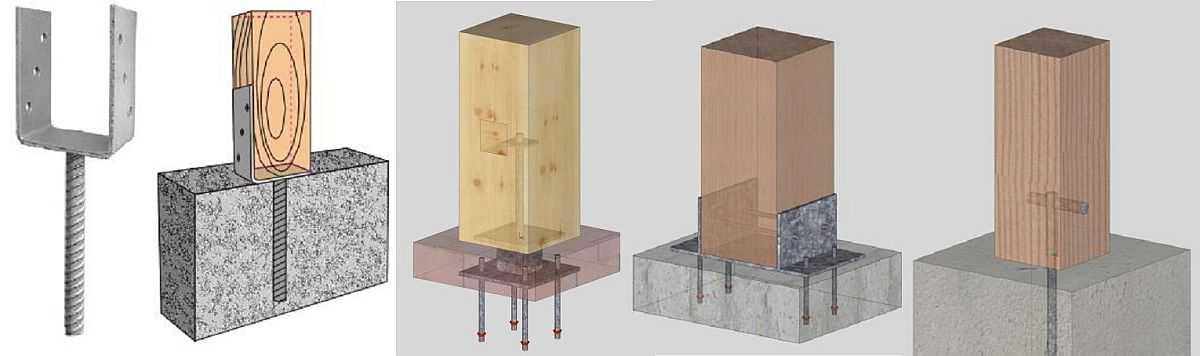 Еще один способ — если площадка забетонирована или на ней уложено покрытие. Тогда берут металлические подпятники. Чаще всего встречаются они в виде перевернутой буквы «П», крепят ее к поверхности площадки. Закрепляют столб болтами насквозь через эти пластины. Такой вид креплежа подойдет для сада, где погрешность закроется растениями. Если же строительство идет на открытой площадке, используют другие подпятники.