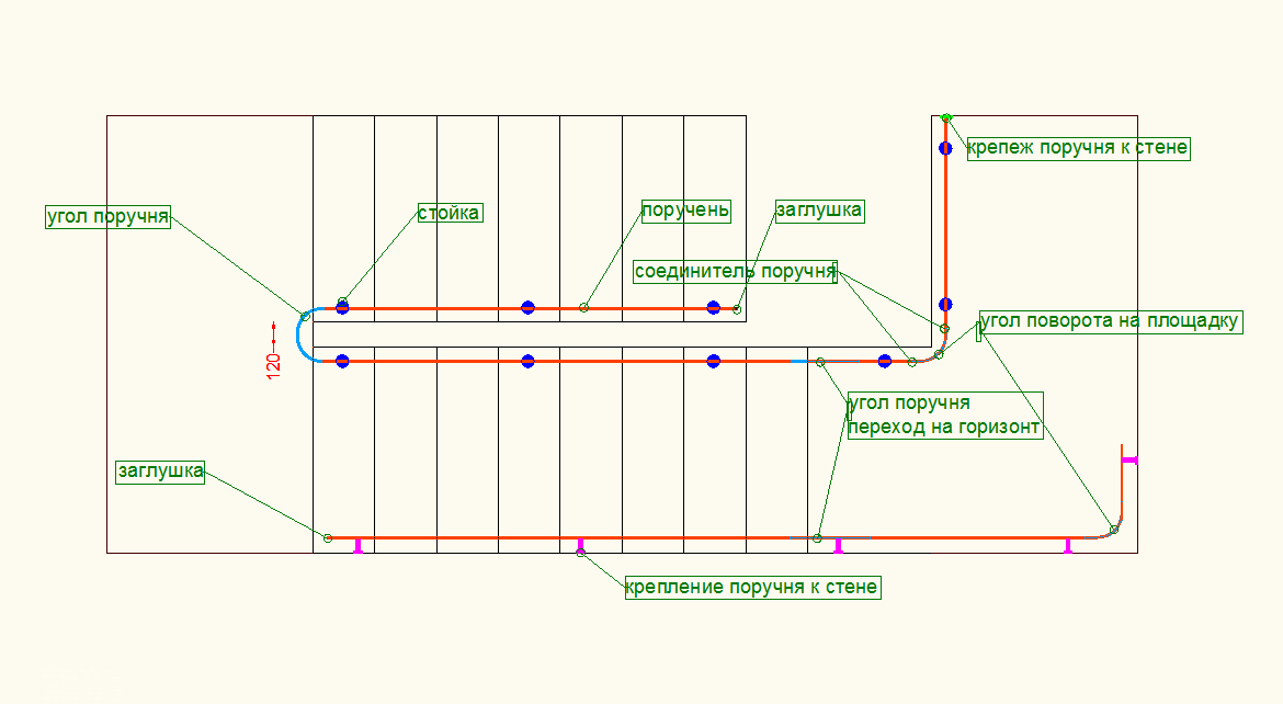 высоту перил для конкретного человека, необходимо, при спуске с лестницы, слегка вытянуть руку вперед и измерить