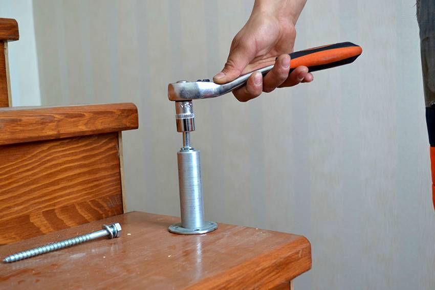 Монтаж стоек с боковой стороны ступени оптимален тогда, когда минимальное расстояние между маршами не превышает 70 см. В этом случае происходит фиксация распорными анкерами, которые крепятся при помощи промежуточной втулки. Для этого в торце перил выполняют 2 отверстия, куда через промежуточные элементы и вставляется анкер. Выступающий конец закрывается посредством колпачковой гайки. Иногда допускается использование анкеров без втулок. Если ограждения устанавливаются на лестницу из бетона, возможен вариант применения жидких гвоздей.