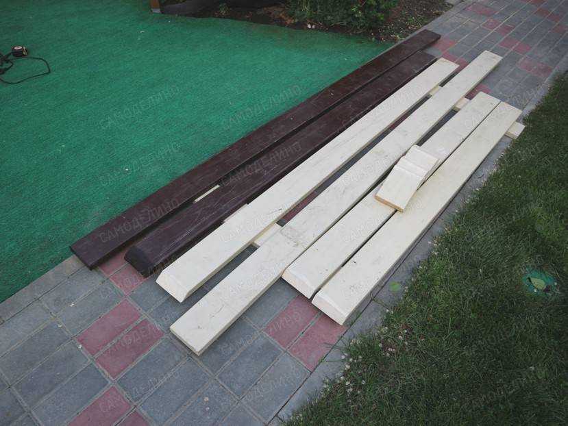 - Оставшиеся доски соединяем попарно, используя бруски (чтобы соединить первые 2 пары потребуются брусья по 25 сантиметров, вторые 2 пары – по 45 сантиметров). Короткие бруски станут сиденьями, длинные – спинками. Выступающие части бруса послужат опорой для спинок.