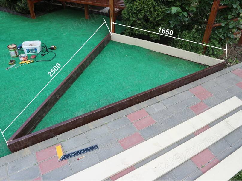 Разметку делают по чертежу песочницы. Если опыта в строительстве мало, то достаточно будет сделать ее просто квадратной. Хочется сделать песочницу сложной конструкции, тогда подготовка должна быть сложнее.
