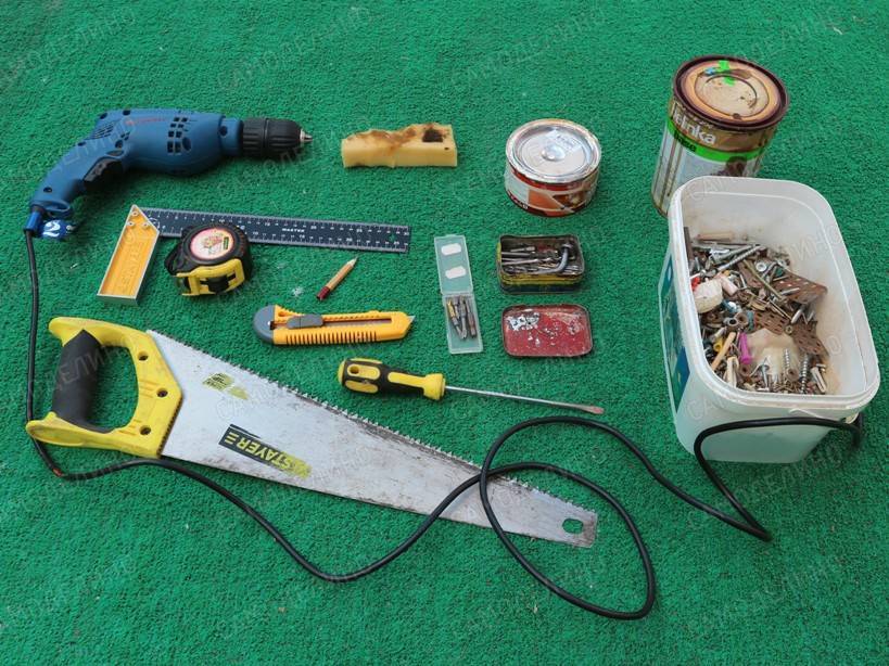 Инструмент: пила, шлифовальная машинка, дрель, сверла, шуруповерт, карандаш, рулетка, уровень, колышки и веревка, кисточки для краски.