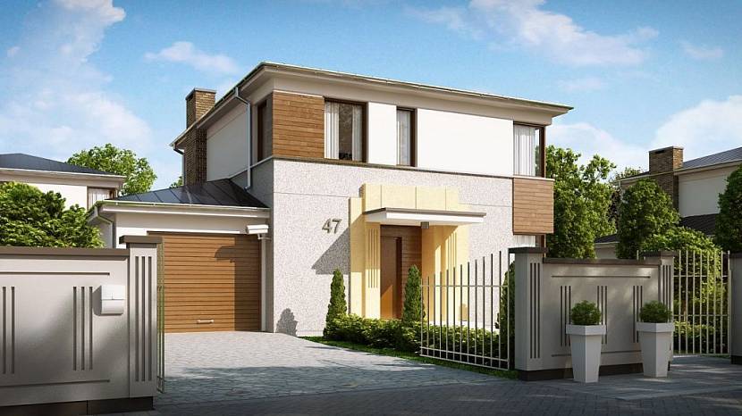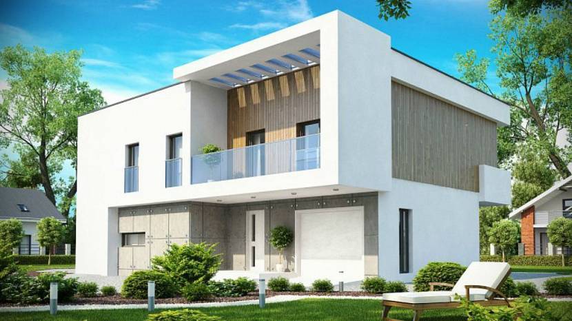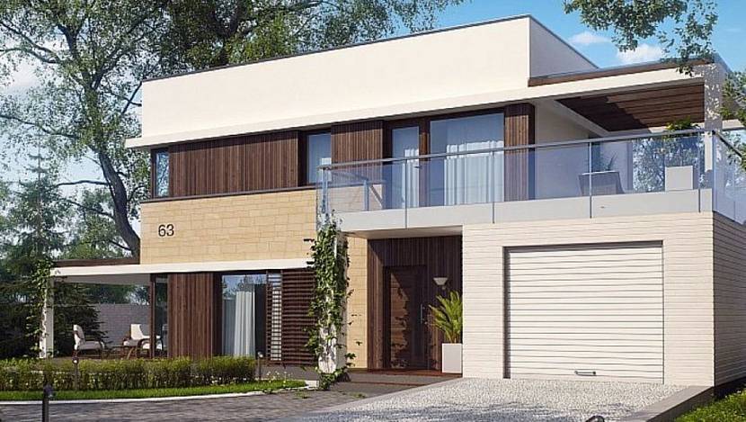Этот вариант планировки предполагает размещение с тыльной стороны постройки просторной террасы. Ее площадь не входит в площадь дома. Этот дом не похож на другие дома, что удалось достичь за счет интересного дизайна. Особенно привлекательным является огромное окно, занимающее полтора этажа, гараж в форме куба, а также навес перед домом. Эти элементы не оказывают решающего значения на стоимость постройки, делая ее уникальной в своем роде.