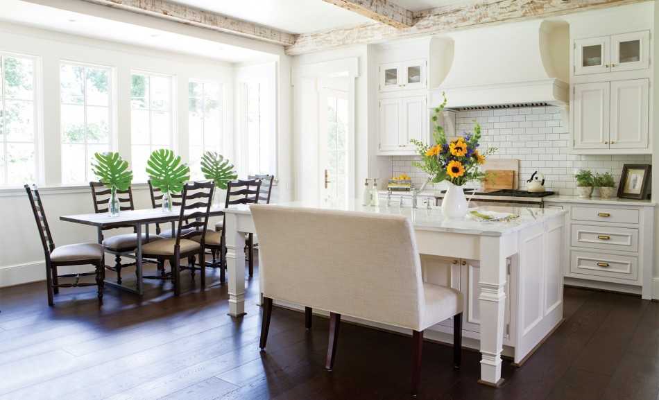 При угловой планировке кухни сложно найти место для барной стойки: человек, который будет за ней сидеть, наверняка помешает проходу остальных, поэтому стоит остановиться на классической обеденной зоне с диваном.