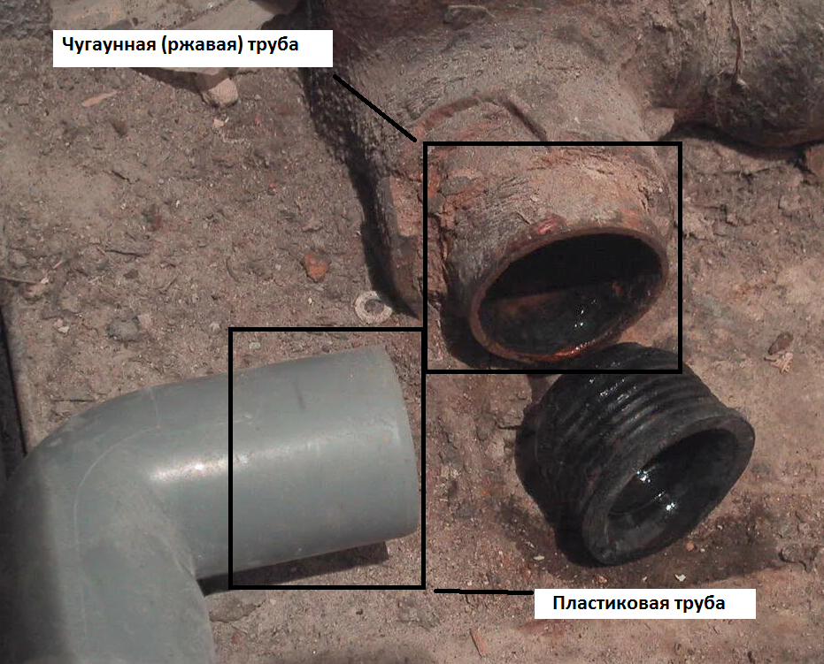 Далее следует этап монтажа пластиковых труб. Чаще всего практикуется раструбное соединение, когда в трубу большего диаметра (в нашем случае, чугунную) вставляется меньшего размера (пластиковая).