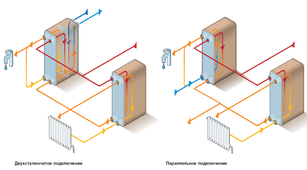 Обыденная практика – использование в котельных двух видов теплообменников. Это средство защиты от гидроударов, химических и механических примесей, перепада высот. Независимые контуры позволяют осуществлять автономный контроль и регулировку каждой конструкции. В таком случае продолжительность эксплуатации котлов значительно увеличивается, накипь на стенках прибора не скапливается.