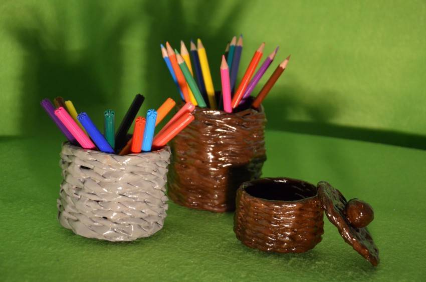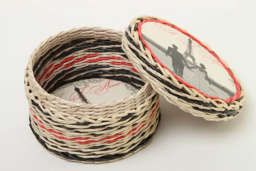 Работу с поделками из трубочек для начинающих можно начать из плетения круглых шкатулок или корзинок.
