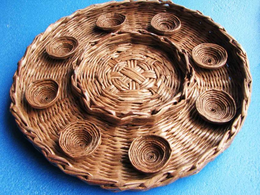 Вот как выглядят изделия, выполненные в этой технике. Четкий аккуратный узор придает изящество даже таким банальным вещам, как простая корзинка или симпатичная конфетница.
