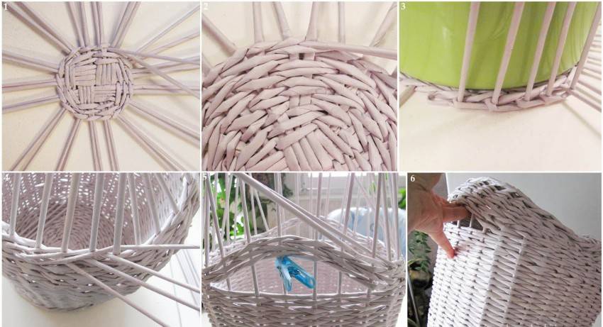 Второй вариант — сплести донышко из газетных трубочек. Понадобятся длинные трубочки — срощенные из двух или трех. Способов много, взяты они, в основном, из плетения из лозы. Принцип один — трубочки по одной или группами — переплетают между собой, формируя центр.
