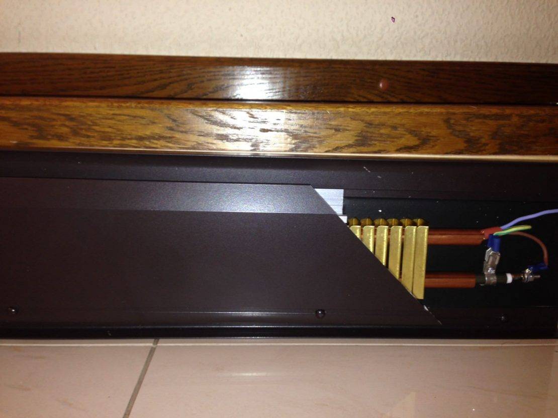 Водяные плинтусные конвекторы работают по принципу естественной конвекции , равномерно обогревая все помещение, как следует из названия, он располагается в том месте, где обычно ставится плинтус. Таким образом, водяной плинтусный конвектор прогревает не только воздух, но и пол и стены. Водяной конвектор-плинтус не создает теплу никаких преград, ведь решетка, которой закрывается корпус с теплообменником, носит чисто декоративный характер, не препятствуя теплообмену – через прорези в ней сверху свободно проходит теплый воздух и всасывается холодный снизу.