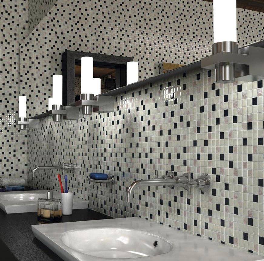 Основа – латунь, нержавеющая сталь. Основные достоинства такой мозаики – прочность, устойчивость к воздействию температур и механическим повреждениям. Подходит для облицовки стен и пола, однако, может выглядеть очень грубо, поэтому использовать её нужно только в определённом дизайнеинтерьера ванной плиткой мозаикой, умело сочетая с мебелью и потолком.
