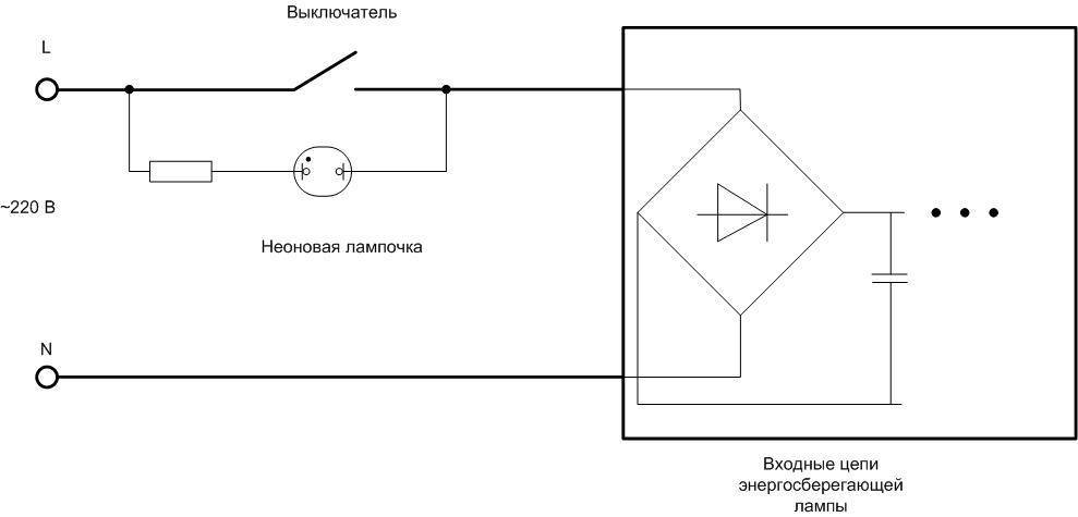И светодиод и неоновая лампа имеют свое сопротивление. Выключатель со светодиодом имеет сопротивление 100 кОм м мощность 1 Вт. С неоновой лампой – 500-1000 кОм и мощность 0,5-1 Вт.При включении контактов выключателя ток идет непосредственно на лампу. А вот когда контакты размыкаются, ток начинает течь через светодиод (или неоновую лампу) подсветки.Конечно, его значение не велико, но вполне достаточно, чтобы подзарядить тот самый фильтрующий конденсатор, о котором мы говорили чуть выше. Конденсатор, подзарядившись, пытается включить энергосберегающую лампу. В этот момент мы и видим ее свечение.Что же делать?Самым простым решением вопроса мигания выключенных ламп может стать отключение в выключателе, как показано на рисунке: