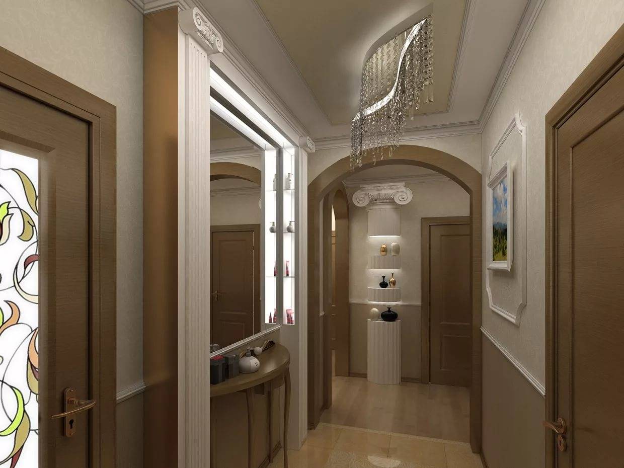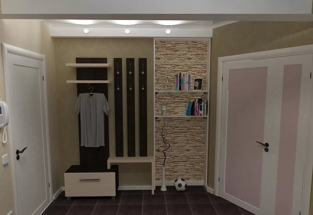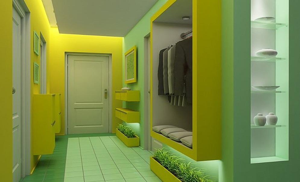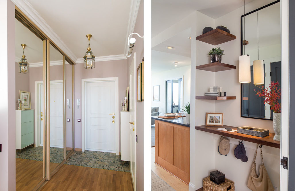 - визуальное расширение пространства. Для этой цели отделка стен и потолка выполняется в светлых тонах, а на дальней стене размещается большое зеркало до самого пола. Решить проблему хранения верхней одежды и обуви можно просто – прикрепить в верхней части стены несколько полочек, а под ними разместить крючки. Вещи, которые в данный момент не используются, помещаются в шкаф, расположенный в гостиной или в кладовую, если таковая имеется;
