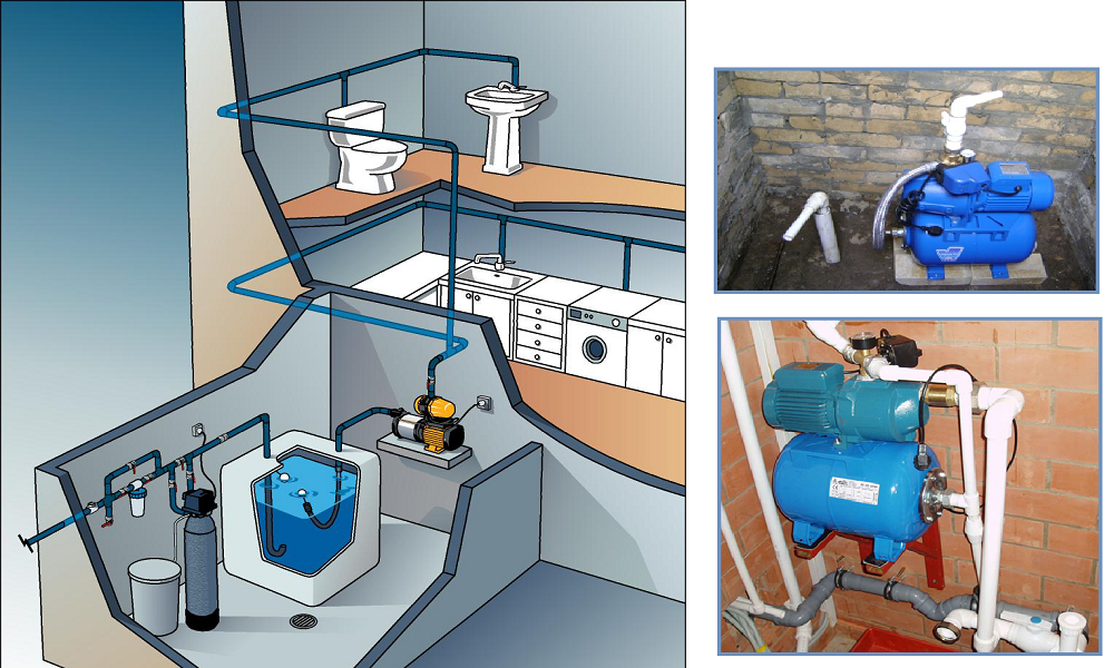 - внутри дома – установка сантехнического оборудования, подключение гидроаккумулятора;