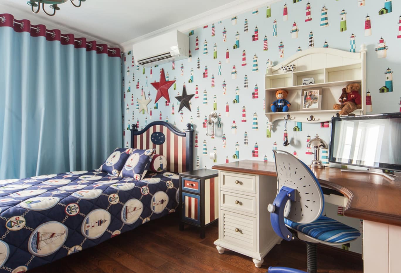 Для девочек чаще всего выбирается нежная сказочная палитра цветов (сиреневая, мятная розовая). Для мальчиков иногда делаются комнаты в морском стиле, используется боевая сине-белая гамма.