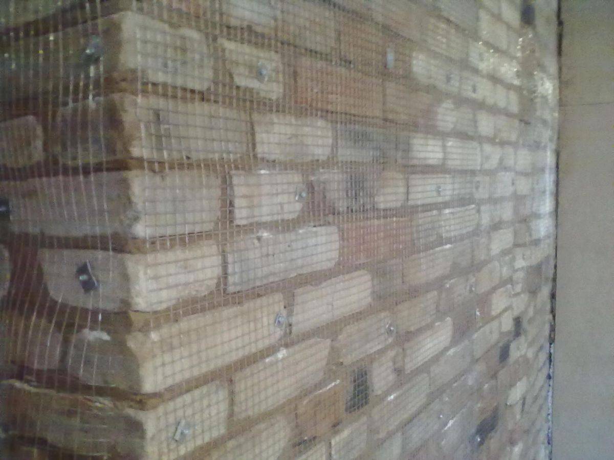 - Штукатурка. Сперва натягивают сетку, устанавливают П-образные скобы. Для защиты от коррозии наносят олифу. Первый слой в 5 мм штукатурки наносят на теплую стену. Второй слой наносится после высыхания первого. Густоту слоя делают гуще, чем предыдущий. Третий слой делают с толщиной до 15 мм.