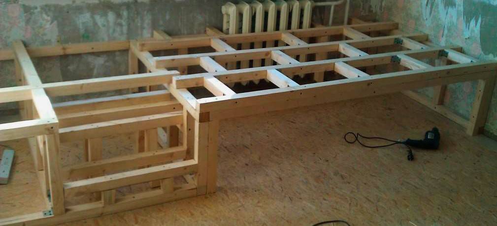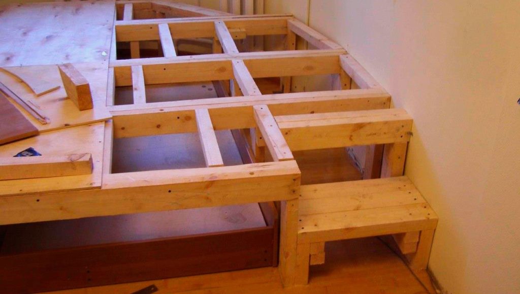 За основу берут участок жилой площади, где будет расположена, например, выдвижная кровать, на нее устанавливают деревянную конструкцию (опалубку) и добавляют бетон. Готовое основание обклеивают напольным покрытием. Сверху устанавливается каркас изделия. Плюсом такой конструкции является то, что оно прослужит длительное время. Минусом – большой вес. Раньше подобные подиумы устанавливались в замках и дворцах.