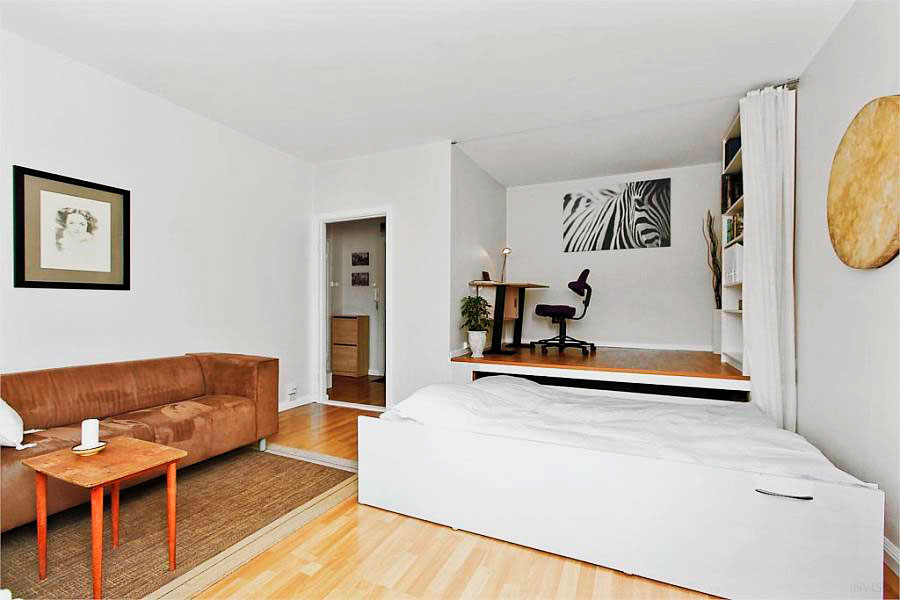 Особенно интересным для малогабаритных квартир является подиум, под которым размещаются кровати, выдвигаемые из-под него на ночь. Высота такой ниши – не менее 35 см.