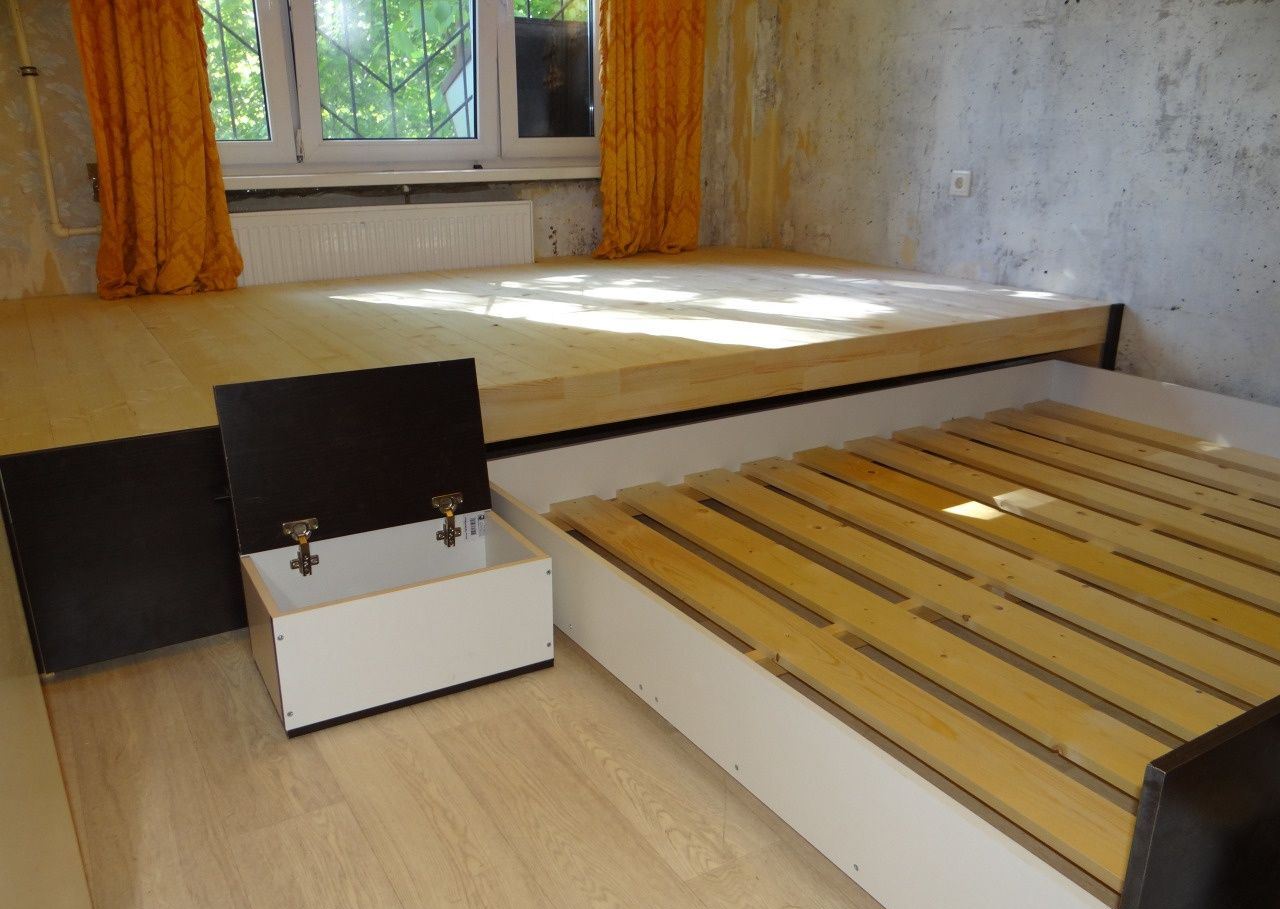 Если предполагается использовать зону под подиумом под системы хранения, обычно под ним предусматривают выдвижные ящики. Высота такого необычного «комода» не менее 30 см и до 1 метра (в этом случае необходимо предусмотреть лестницу, ведущую на подиум). Каркас должен быть прочным, так же как и настил.