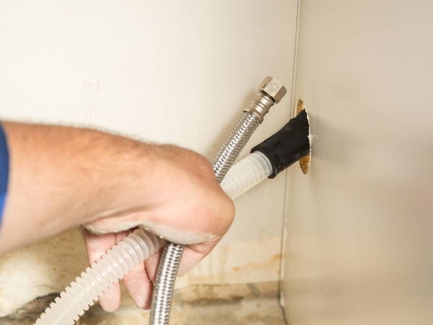Наилучший вариант – подключиться к смесителю раковины, расположенной рядом с ПММ. Для этого перекройте подачу холодной воды и найдите то место, где гибкий шланг от смесителя подсоединен к трубе, подающей холодную воду. В этом месте ослабьте крепление и открутите гайку, фиксирующую соединение гибкого шланга с трубой, затем извлеките шланг.
