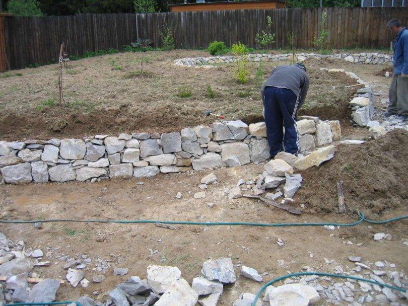 Тип фундамента организуют ленточный. Если раствор при возведении стенки не применяют, швы можно наполнить почвой, в которую потом посадить семена культур, имеющих мочковатую корневую систему. Это сделает конструкцию эстетичнее и прочнее.