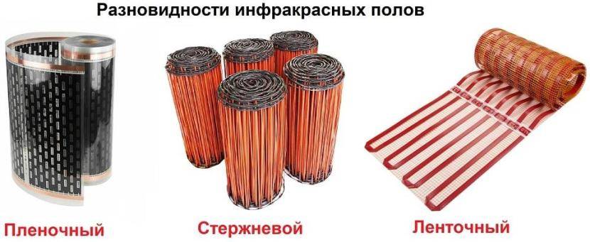 ИК тёплый пол встречается разных видов. Этим нужно руководствоваться при выборе материала для напольного покрытия и самого оборудования. Подключение инфракрасного тёплого пола тоже зависит от его типа и характеристик. Выделяют плёночные, ленточные и стержневые полы. Плёнка и лента действуют по схожему принципу, поэтому их можно рассматривать как одну разновидность.