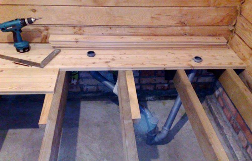 Чтобы не перегружать перекрытия, можно сделать подиум в душе или ванной на лагах. Вариант спорный, так как высокая влажность и древесина не очень хорошо сочетаются, но иногда это — единственный выход. При выборе такого устройства слива в полу, использовать надо хорошо просушенную древесину. Перед использованием ее обрабатывают защитными составами (по инструкции, но не менее двух раз). Выбирать желательно из тех пропиток, которые предназначены для наружных работ или для прямого контакта с грунтом — степень защиты у них выше. После высыхания состава можно приступать к работе.