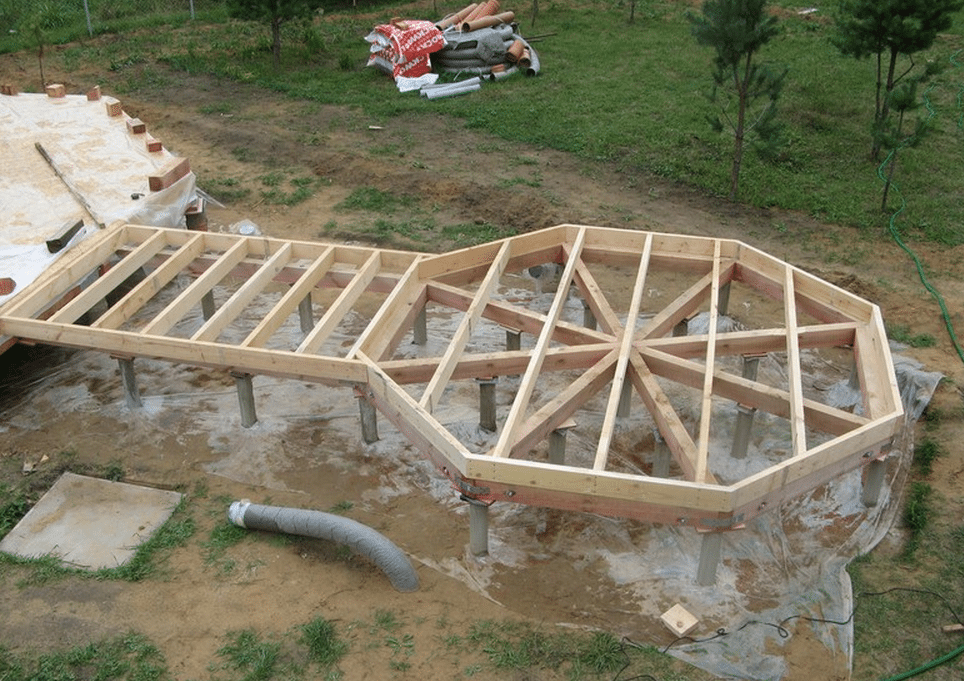 - К тому же, если у вас беседка сложной формы, например 6-8 угольная, то вы попросту не сможете нормально закрепить обшивку, ведь столбики фундамента будут установлены кругами, а обвязка будет напоминать форму долек апельсина. В этом случае также устанавливаются дополнительные лаги поверх обвязки, как это показано на фото внизу.