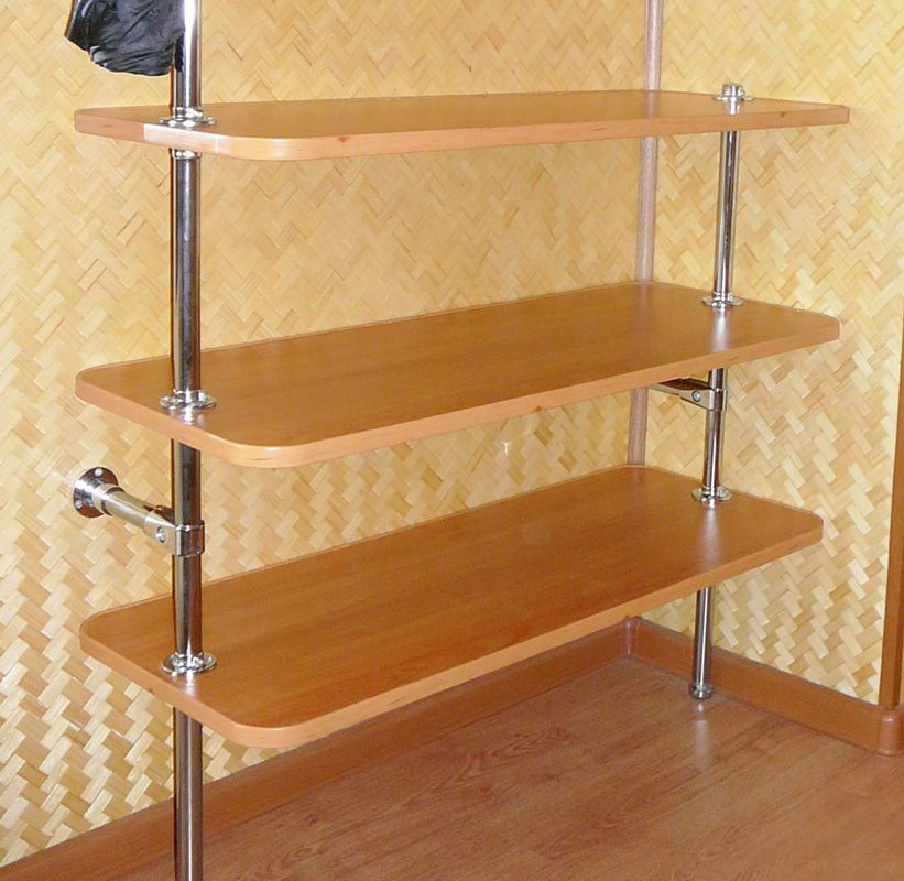 Конструкция состоит из горизонтальных плоскостей в разных уровнях. Это самое простое решение полок в шкафу купе. К недостаткам такой системы хранения относится открытое положение обуви во внутреннем пространстве гардероба, ограниченность в количестве хранимых пар и неудобство их использования.