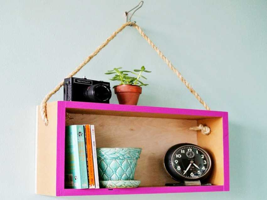 Вы можете немного поэкспериментировать со способами крепления веревок и своими руками сделать не только полки, но даже подвесные стеллажи.